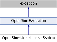 Inheritance diagram for OpenSim::ModelHasNoSystem:Public Member Functions | |