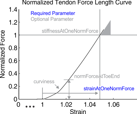 | normForceAtToeEnd | The normalized force developed at the end of the 'toe' region. The toe region lies between 0 strain and some intermediate strain less than the strain required to develop 1 unit of normalized force. The toe region is nonlinear and more compliant than the rest of the tendon curve. |